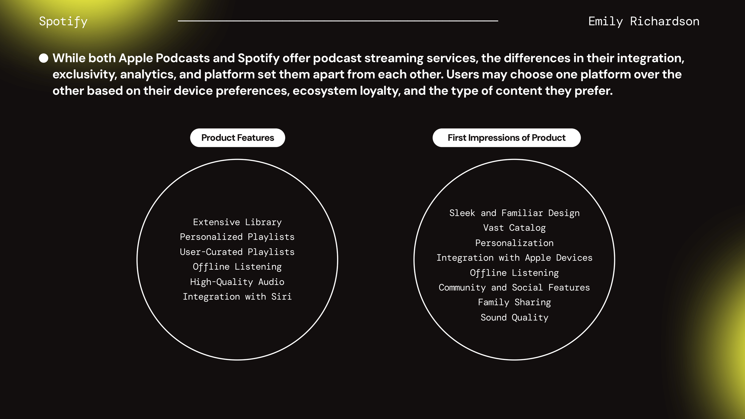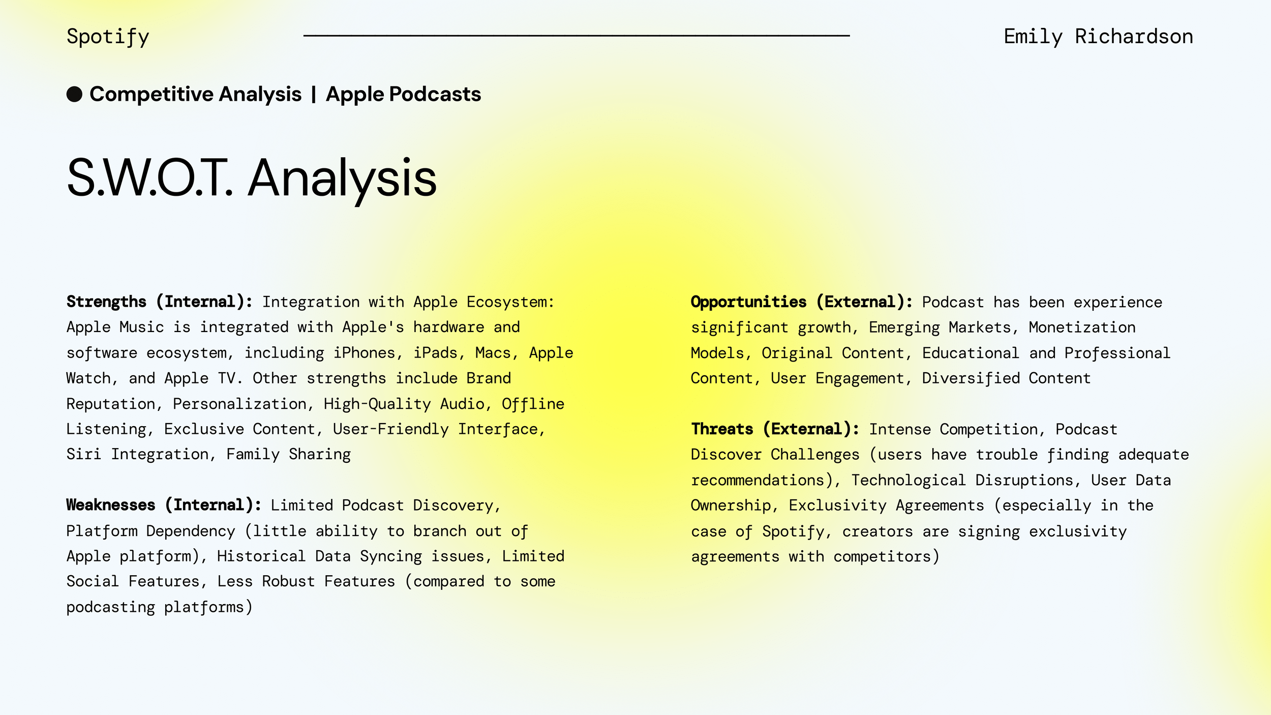 In order to thoroughly understand the competitive landscape, I conducted an in-depth analysis of competitors in the market. These competitors included Apple Podcasts, Amazon Music, Stitcher.
